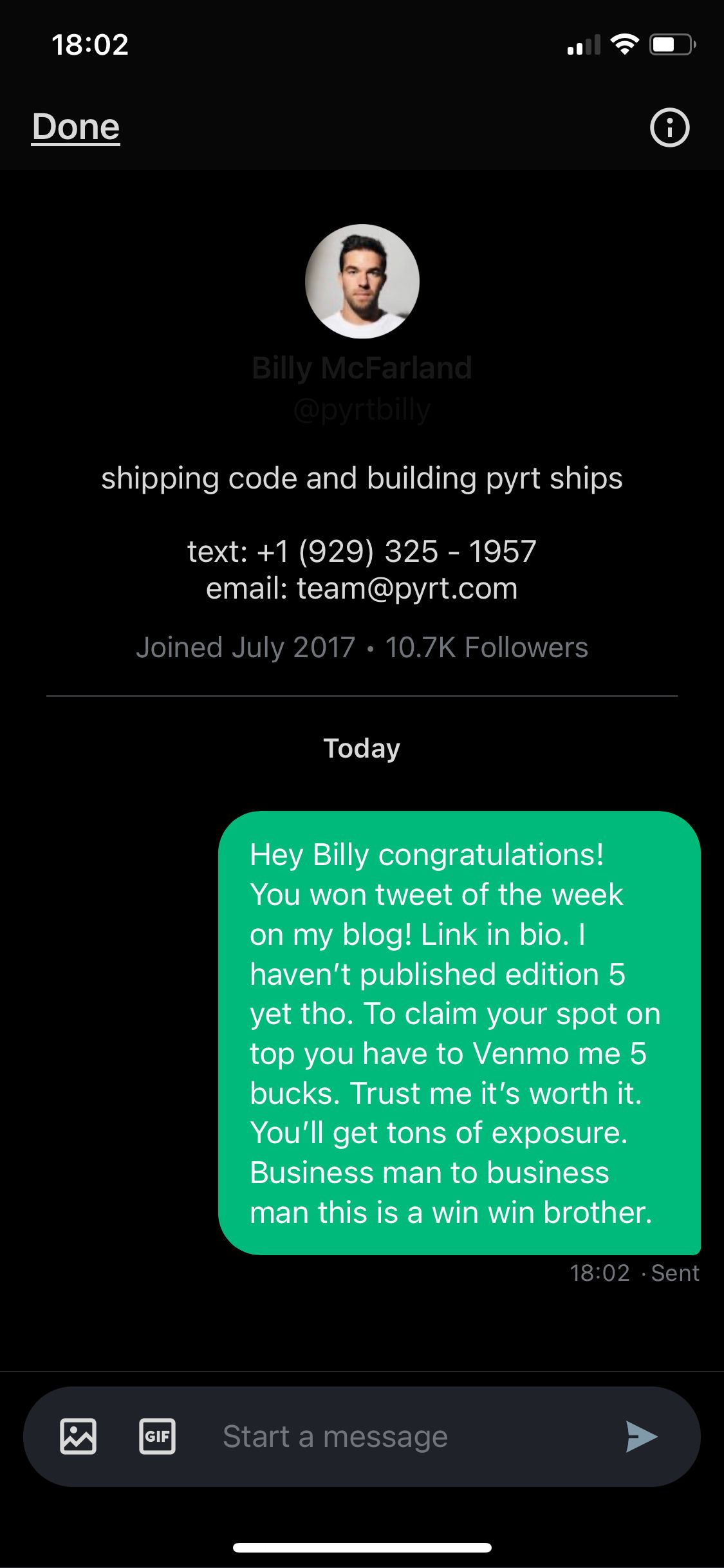 Billy just never stops. This gets totw based on hustle alone. If you're unfamiliar, this is the ring leader from the original Fyre fest, the event that sent him to prison. Fresh out the clink, with all new perspective and he's doubling down. What a guy.